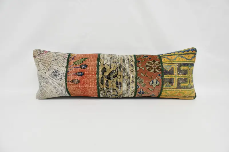 Embroidered Patchwork Throw Pillow, 12x36 Handmade Hemp Pillow