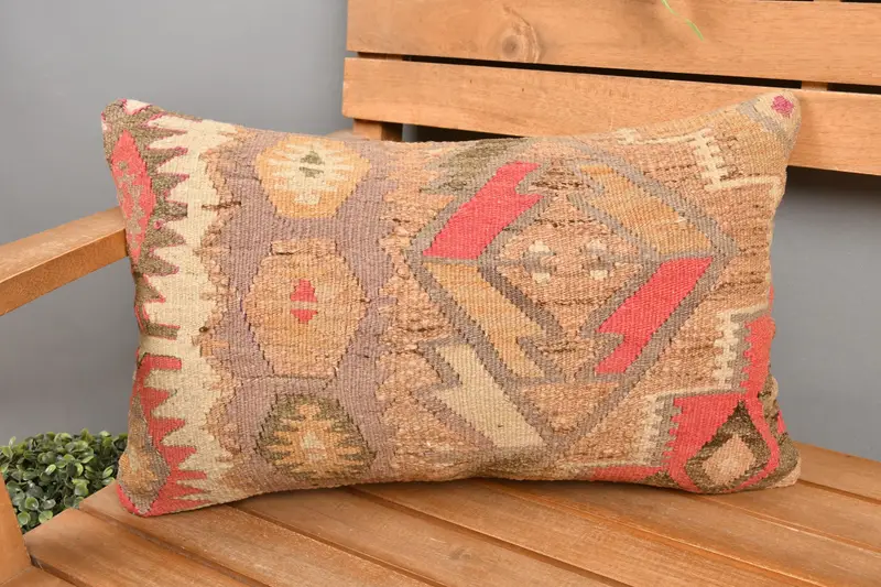 Handmade Embroidered Throw Pillow, Vintage Beige & Pink Geometric Pillow