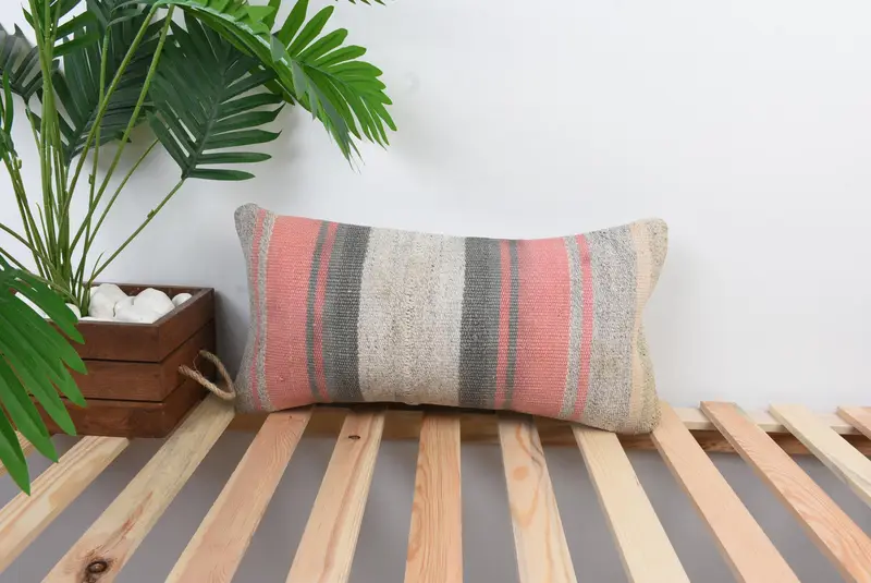 Gray & Pink Striped Throw Pillow, Embroidered Vintage Cushion