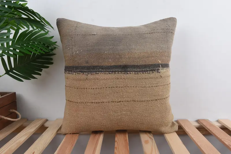 Beige & Brown Embroidered Patchwork Throw Pillow, Vintage Handmade Cushion