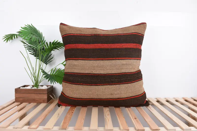 Beige & Brown Striped Throw Pillow, Vintage Embroidered Cushion