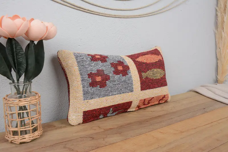 Red Geometric Throw Pillow, 10x20 Vintage Cushion with Bronze Accents