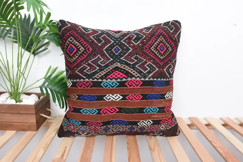 Brown & Pink Embroidered Throw Pillow, 22x22 Geometric Cushion