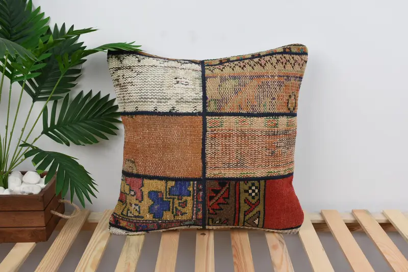 Orange & Bronze Patchwork Throw Pillow, Handmade Vintage Pillow