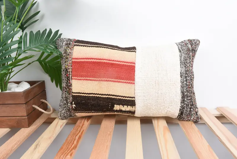 Embroidered Beige & Brown Patchwork Throw Pillow, Handmade Rectangle Pillow