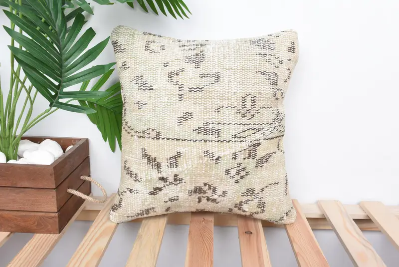 Handmade Beige & Brown Floral Throw Pillow, 14x14 Embroidered Cushion