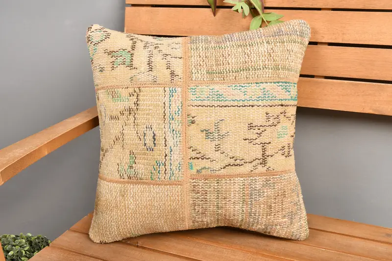 Brown & Green Patchwork Throw Pillow, 16x16 Embroidered Cushion