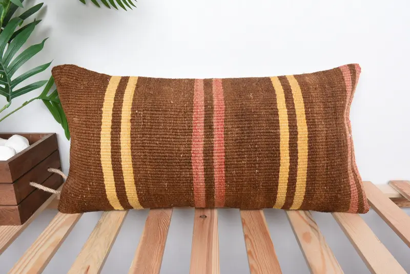 Brown & Yellow Striped Throw Pillow, Handmade Vintage Pillow