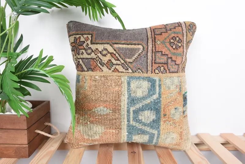 Beige & Gray Patchwork Throw Pillow, Handmade Embroidered Pillow