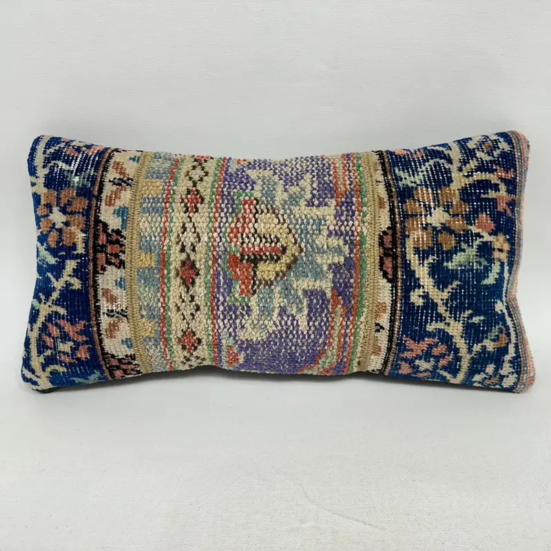 Blue & Beige Patchwork Throw Pillow, Handmade Embroidered Cushion