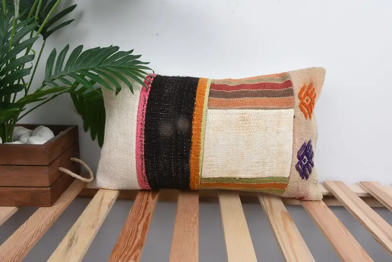 Beige & Orange Patchwork Throw Pillow, Handmade Embroidered Cushion