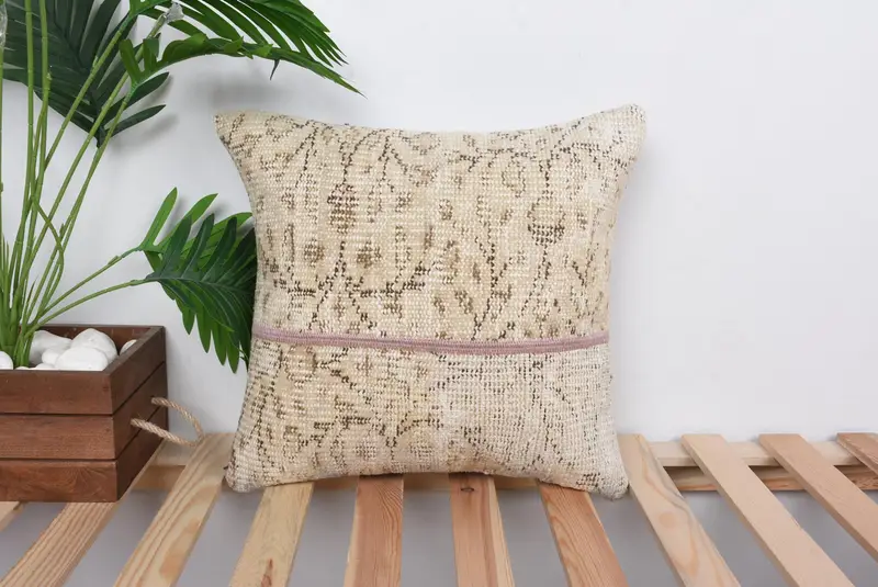 Beige Embroidered Patchwork Throw Pillow, Handmade Linen Cushion
