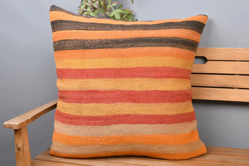 Embroidered Orange & Red Stripe Throw Pillow, Handmade Vintage Cushion