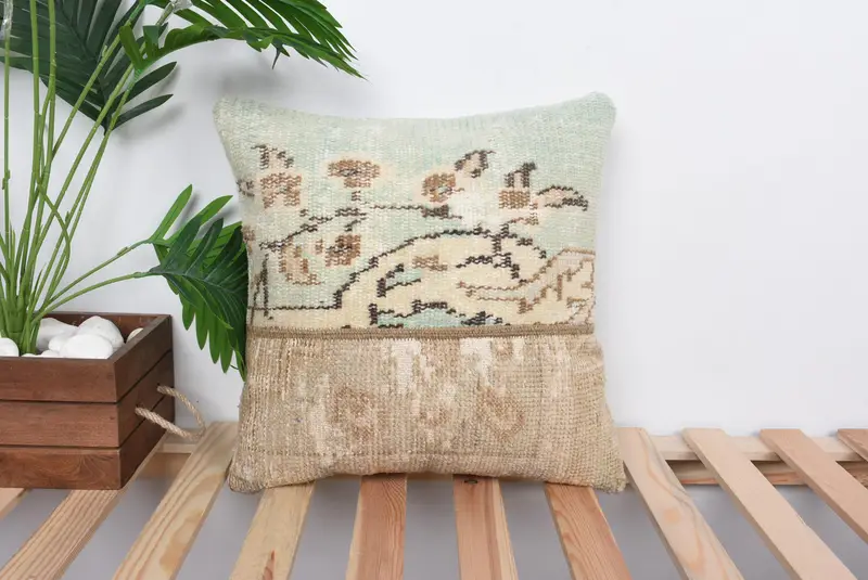 Handmade Green & Brown Patchwork Throw Pillow, Vintage Embroidered Cushion