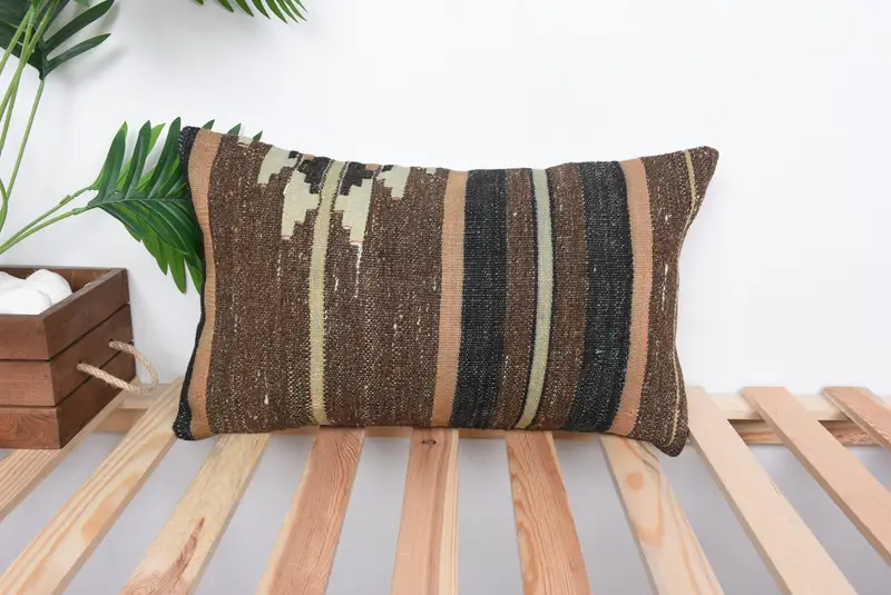 Brown & Beige Striped Throw Pillow, Handmade Embroidered Pillow