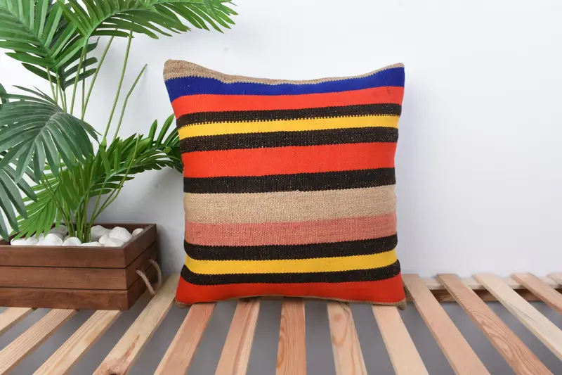 Red & Yellow Striped Throw Pillow, Handmade Embroidered Cushion