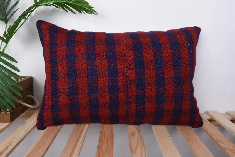 Embroidered Blue & Red Striped Pillow, Handmade Vintage Throw Pillow
