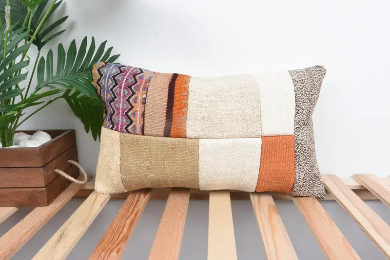 Handmade Beige & Orange Patchwork Throw Pillow, 12x20 Vintage Cushion