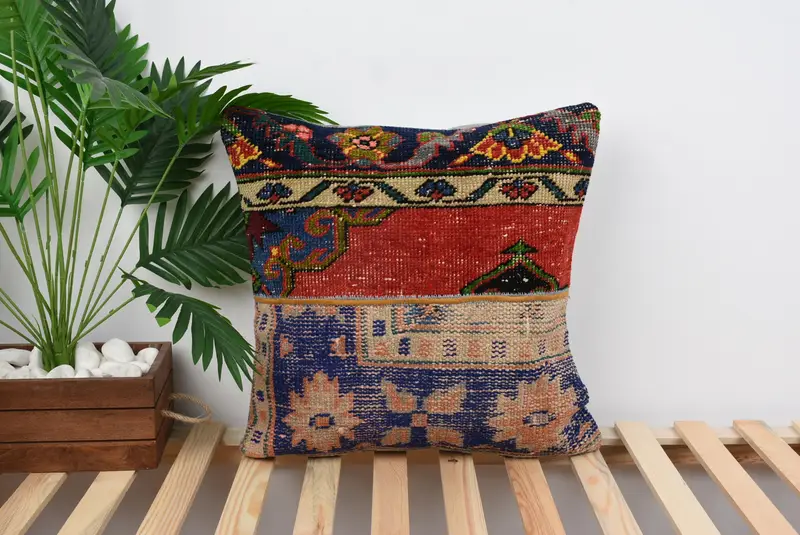 Red Linen Throw Pillow, 20x20 Patchwork Cushion with Vintage Charm