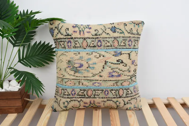 Beige & Green Patchwork Throw Pillow, Embroidered Vintage Cushion