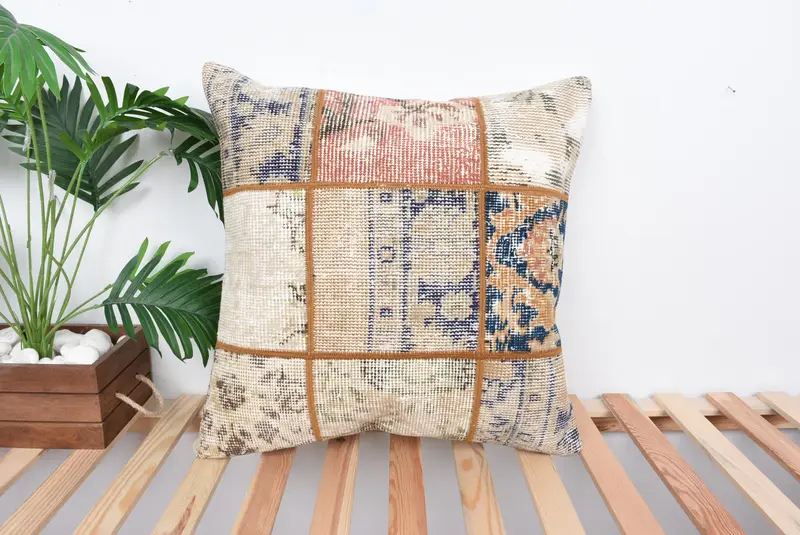 Brown & Green Striped Throw Pillow, Vintage Embroidered Cushion
