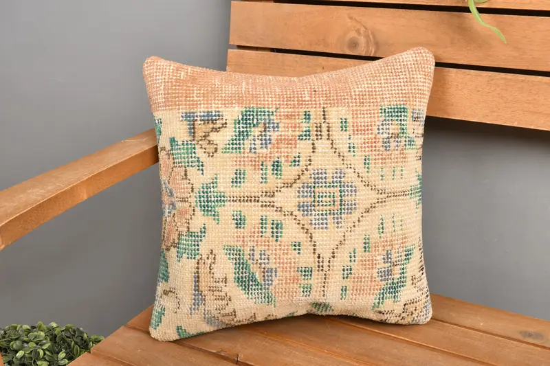 Orange & Green Floral Embroidered Throw Pillow, Handmade Vintage Pillow