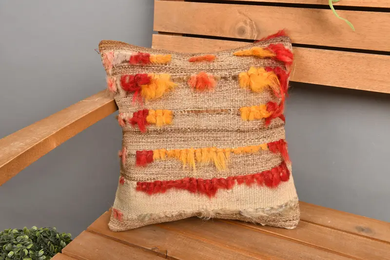 Brown & Red Striped Linen Throw Pillow, Vintage Embroidered Cushion