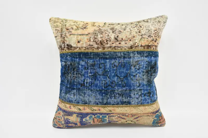Handmade Blue & Beige Throw Pillow, Embroidered Vintage Cushion