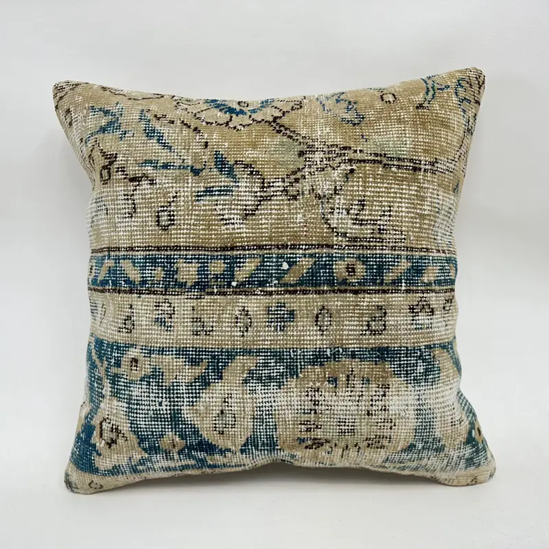 Handmade Blue & Green Floral Throw Pillow, Vintage Embroidered Cushion