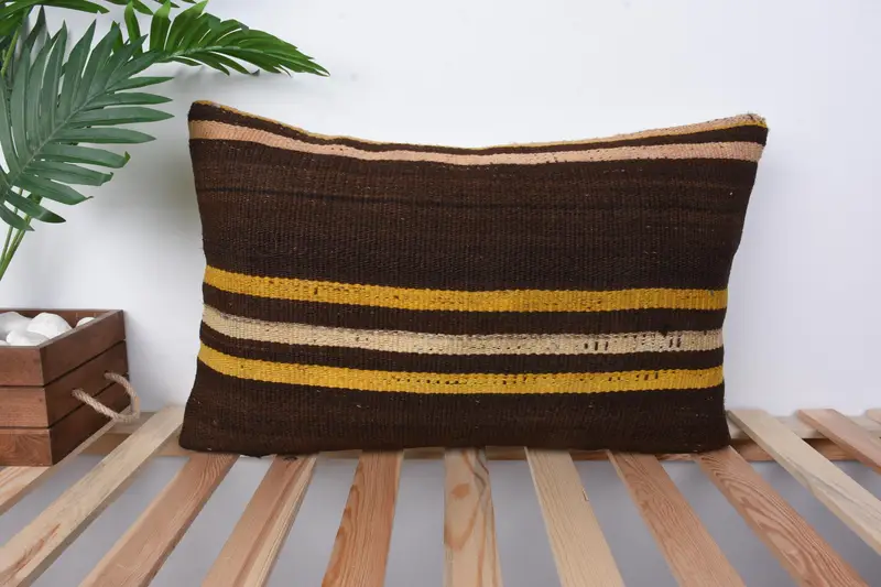 Brown & Yellow Striped Throw Pillow, Handmade Embroidered Pillow