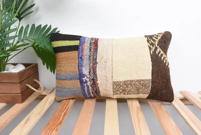 Beige & Bronze Patchwork Throw Pillow, Handmade Rectangle Cushion