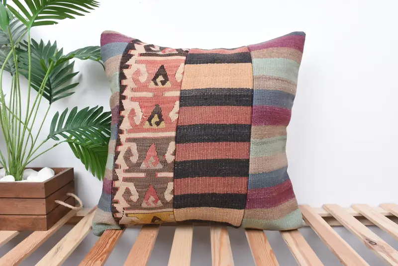 Red & Brown Patchwork Throw Pillow, 22x22 Embroidered Cushion