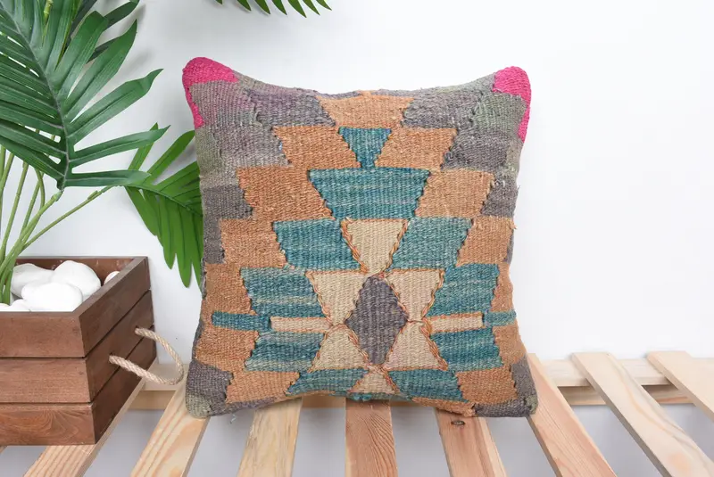 Geometric Green & Orange Embroidered Pillow, Versatile 14x14 Throw Pillow