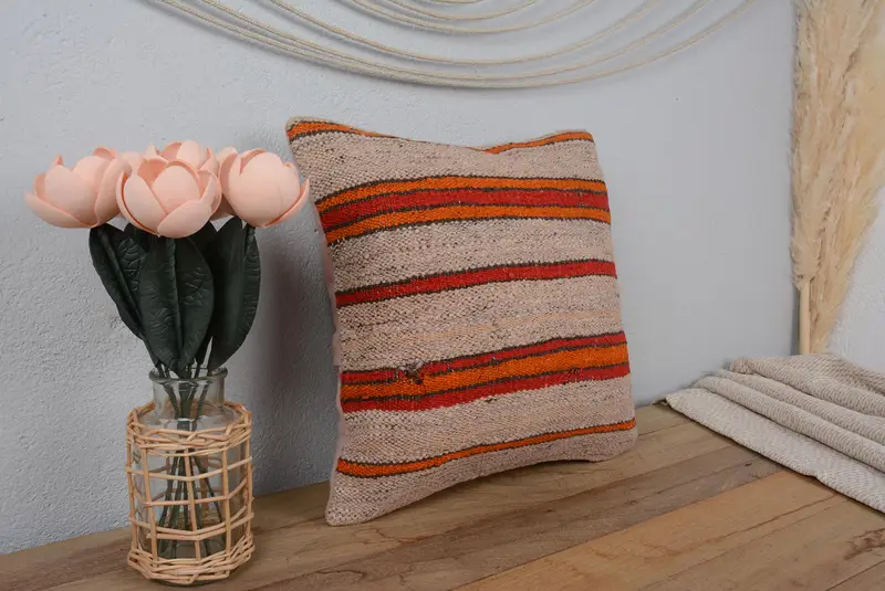Red & Orange Striped Throw Pillow, Handmade Embroidered Linen Pillow
