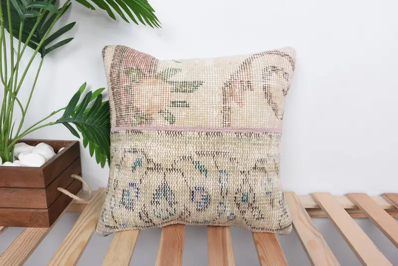 Beige & Brown Striped Throw Pillow, Handmade Embroidered Cushion