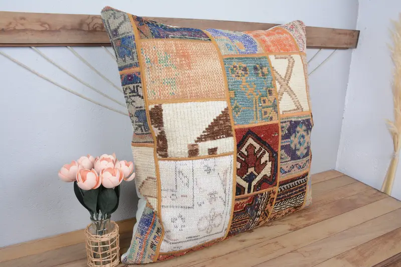 Handmade Embroidered Throw Pillow, Vintage Patchwork Cushion