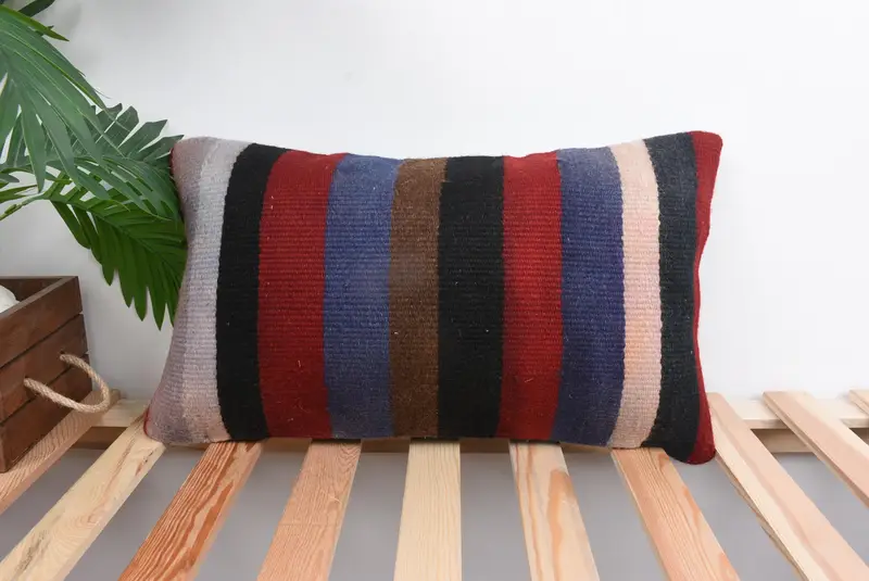 Handmade Embroidered Throw Pillow, Blue & Red Striped Cushion