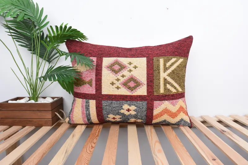 Beige & Red Embroidered Pillow, 20x28 Handmade Throw Pillow