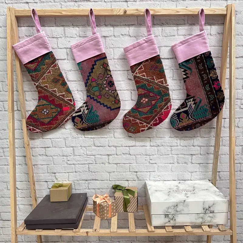 Gray Christmas Stocking with Pink Ornaments, 6-Inch Wide Festive Decor