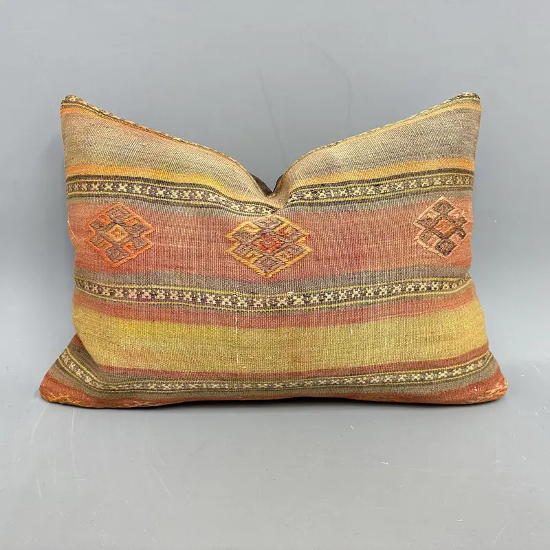 Handmade Brown Striped Throw Pillow, Embroidered Vintage Cushion