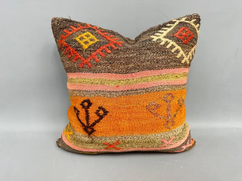 Orange & Brown Striped Throw Pillow, Handmade Linen & Wool Cushion