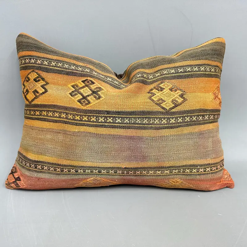 Handmade Brown Striped Throw Pillow, Vintage Embroidered Cushion