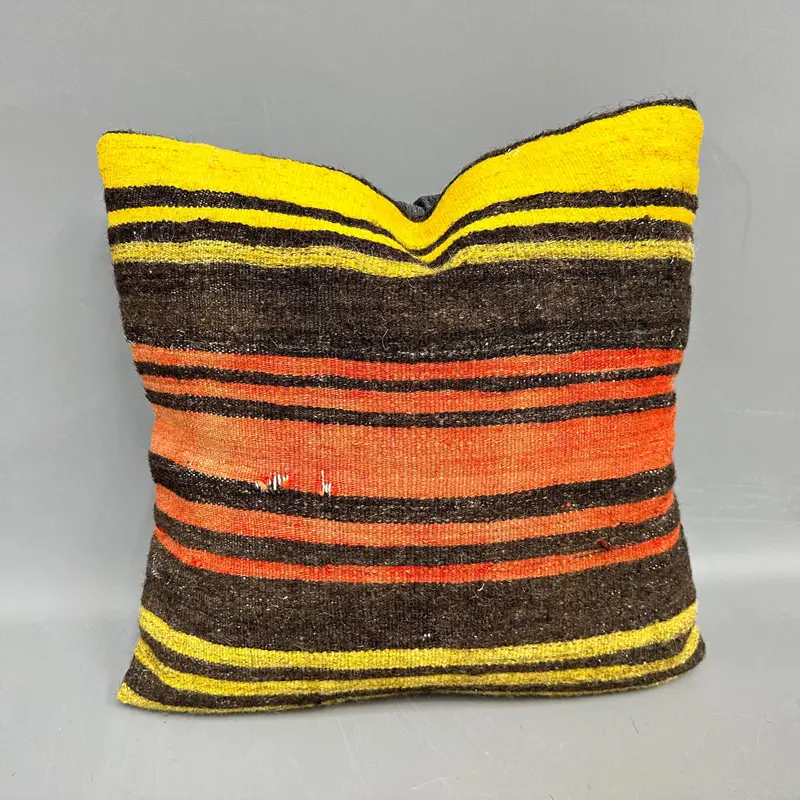 Handmade Striped Throw Pillow, Brown & Orange Vintage Linen Pillow