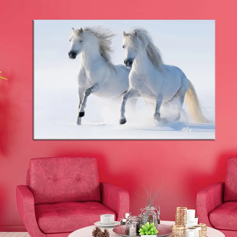 Elegant White Horse Canvas: Winter Snow Scene Art Print