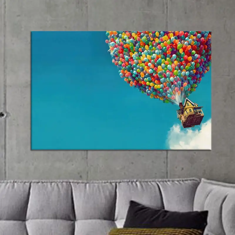 Vibrant Air Balloons House Canvas: Colorful Sky Landscape Art
