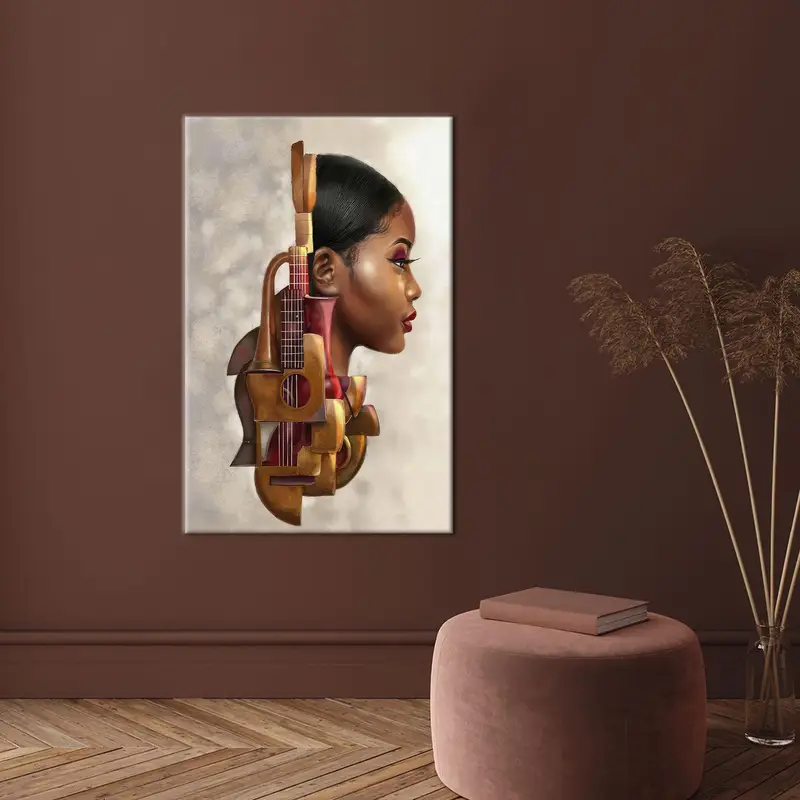 Modern African Woman Canvas: Abstract Melody of Violin & Saxophone