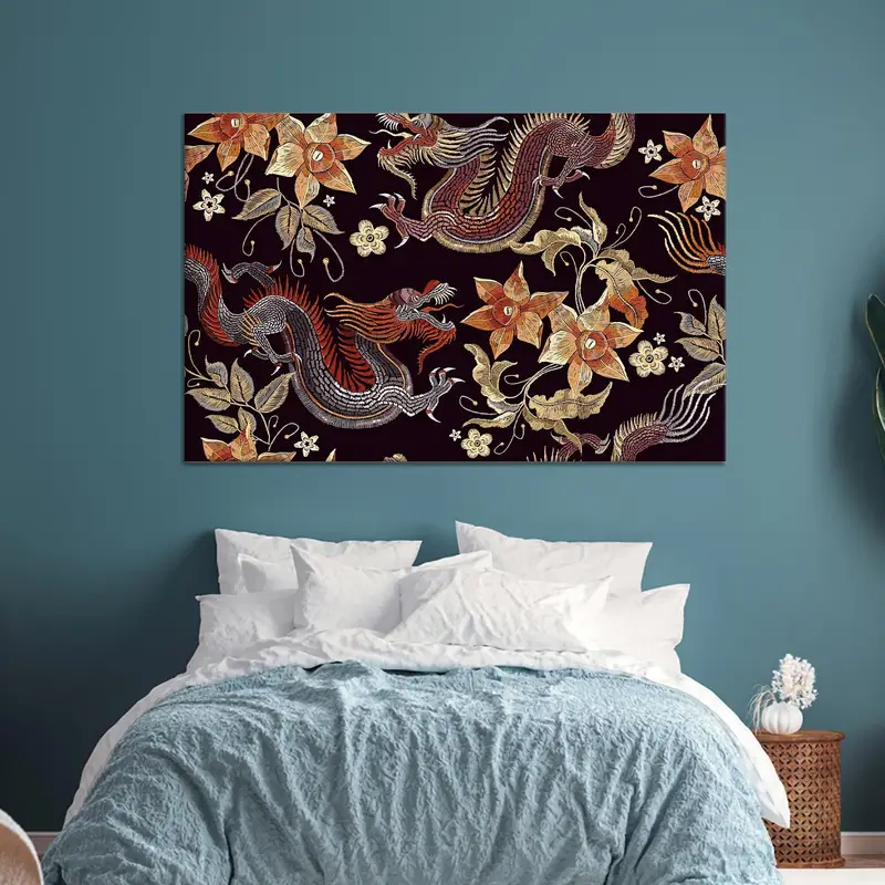 Elegant Myth Dragon Canvas: Japanese Pattern & Floral Fusion