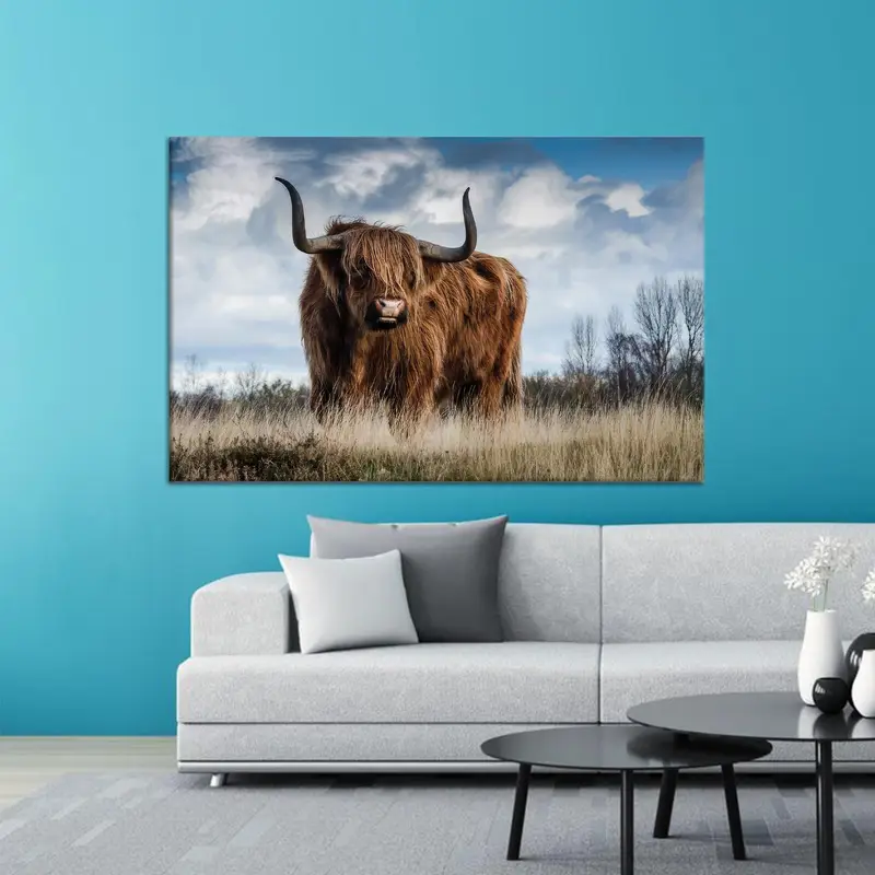 Elegant Highland Cow Village Canvas: Artistic Farmhouse Decor