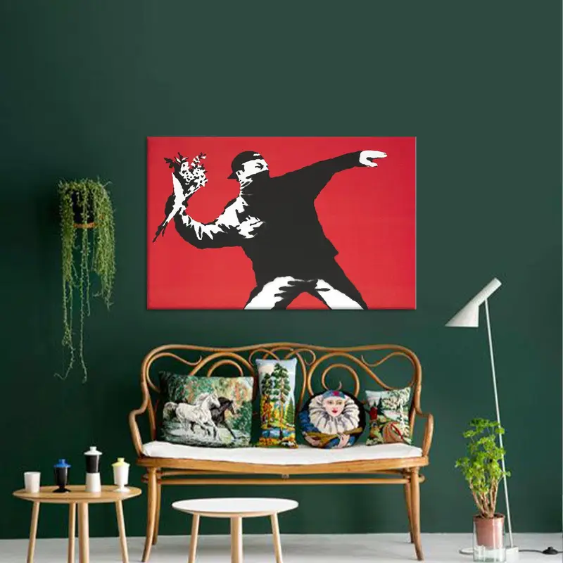 Elegant Banksy Flower Thrower Printed Canvas Art - Vibrant Graffiti
