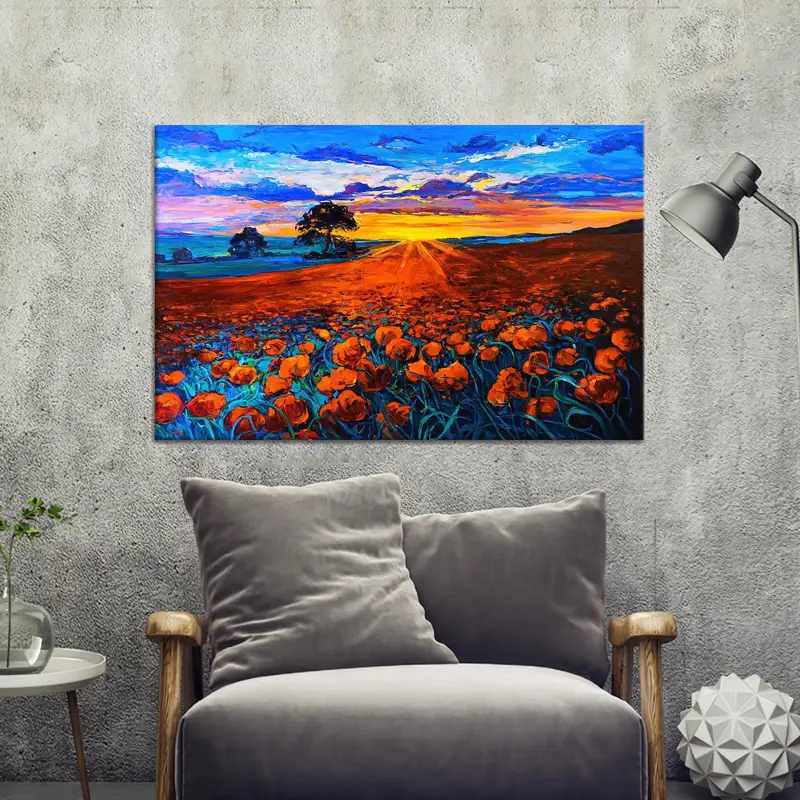 Sunset Landscape Canvas: Red Flower Field Oil Print